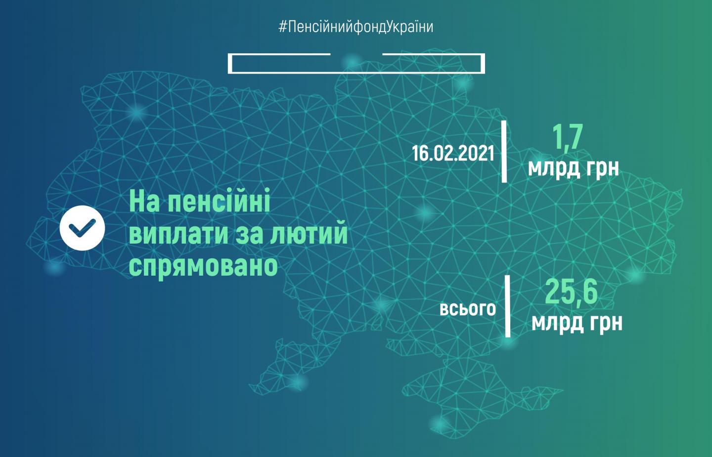 На пенсійні виплати сьогодні спрямовано 1,7 млрд грн. Забезпечено фінансування пенсій лютого на загальну суму 25,6 млрд грн.