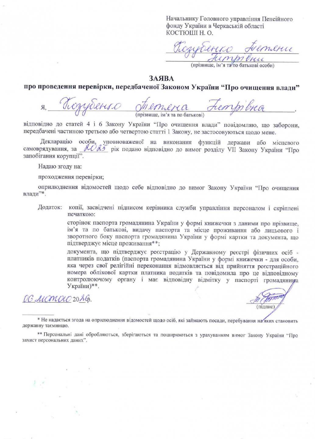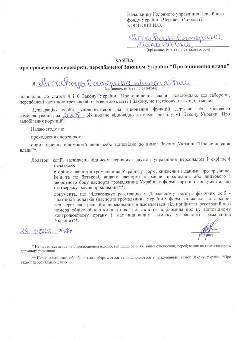 СИДОРУК Катерина Миколаївна | головний спеціаліст відділу розгляду зверненьуправління обслуговування громадян | 03.11.2025 | Заява Сидорук К. М. | Заборони, передбачені частинами третьою і четвертою статті 1 Закону України «Про очищення влади», не застосовуються |