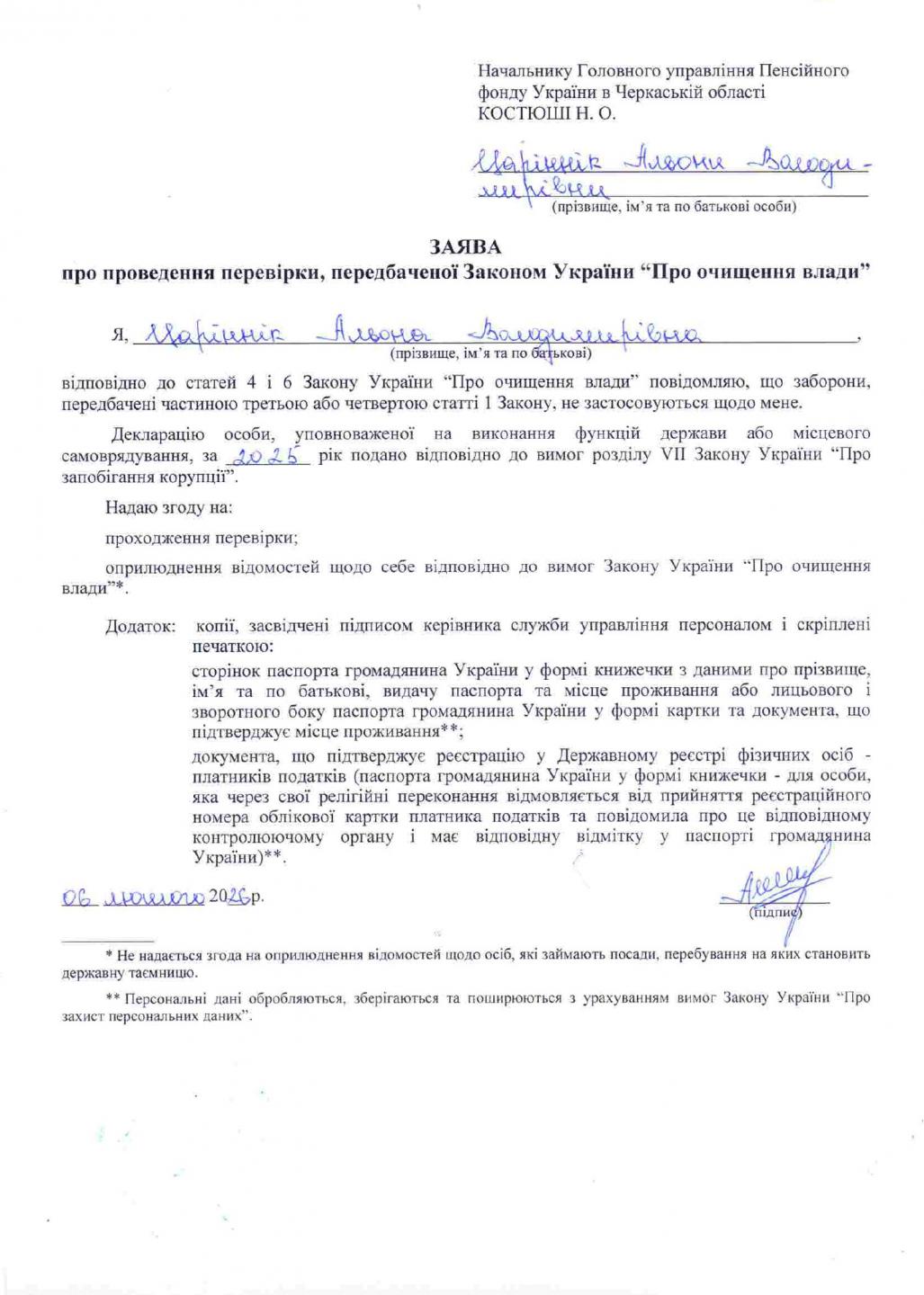 головний спеціаліст відділу перерахунків пенсій № 1 управління пенсійного забезпечення, надання страхових виплат та соціальних послуг | 09.02.2026 | Заява Царіннік А. В. |