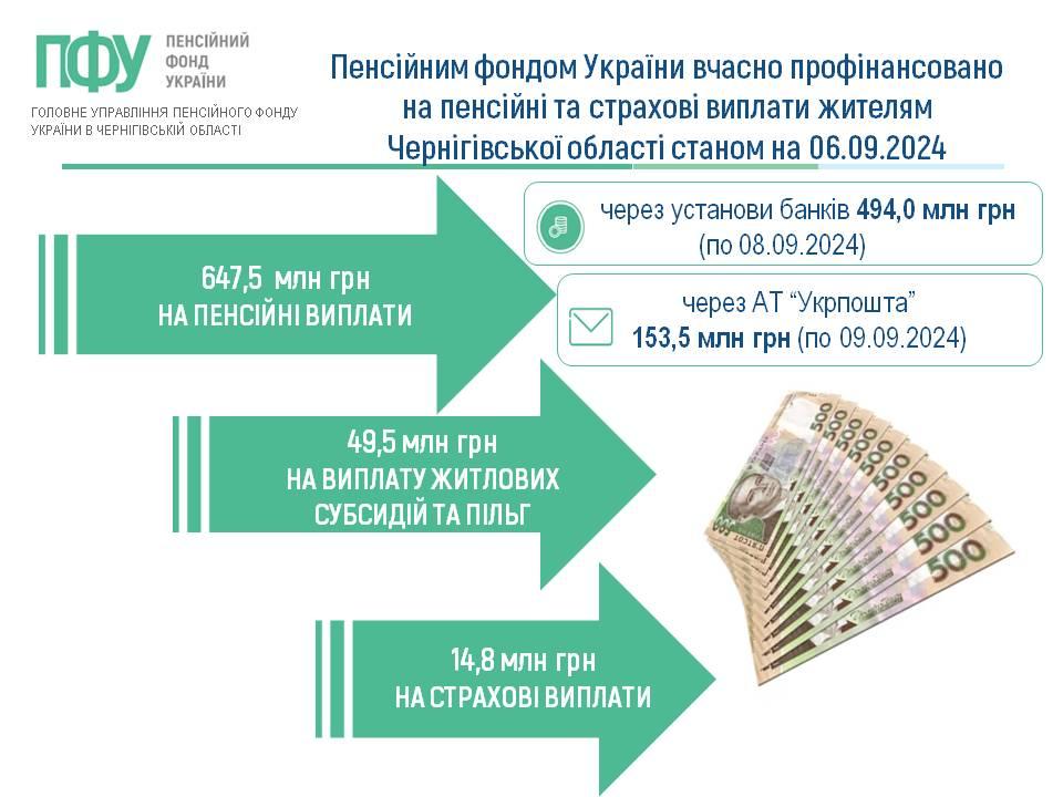 Пенсійним фондом України вчасно профінансовано на пенсійні та страхові виплати жителям Чернігівської області станом на 06.09.2024