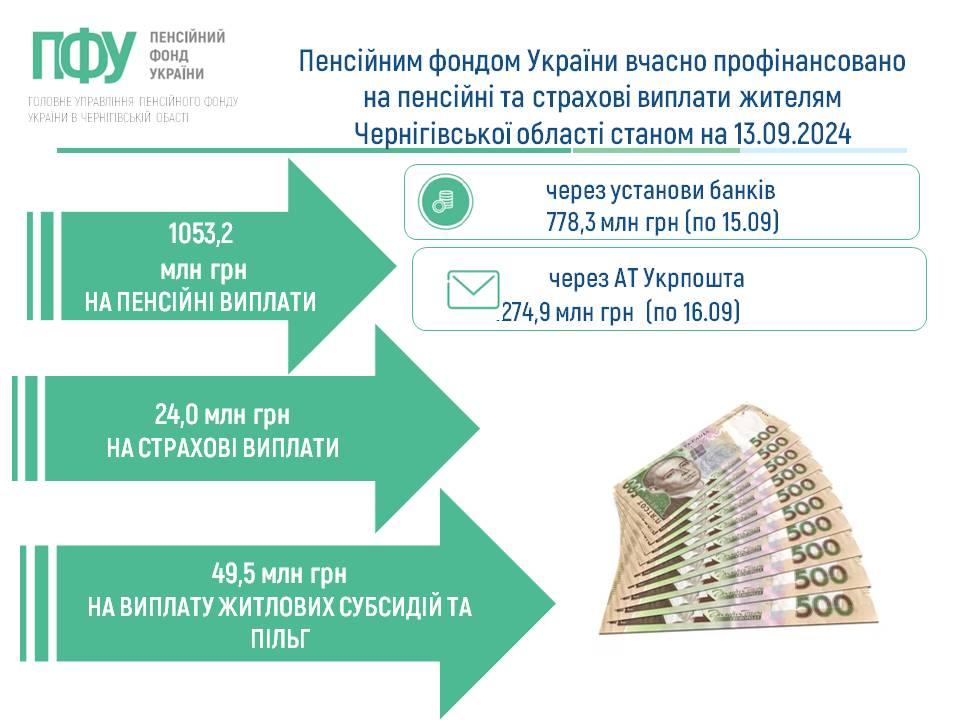 Пенсійним фондом України вчасно профінансовано на пенсійні та страхові виплати жителям Чернігівської області станом на 13.09.2024