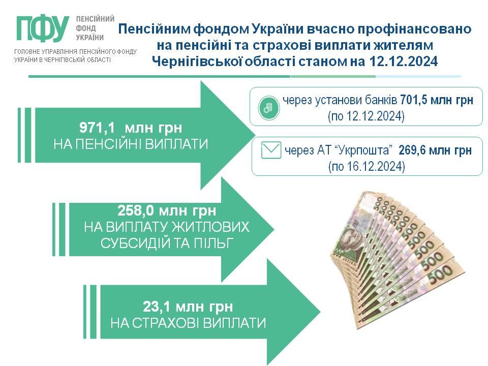 Пенсійним фондом України вчасно профінансовано на пенсійні та страхові виплати жителям Чернігівської області станом на 12.12.2024