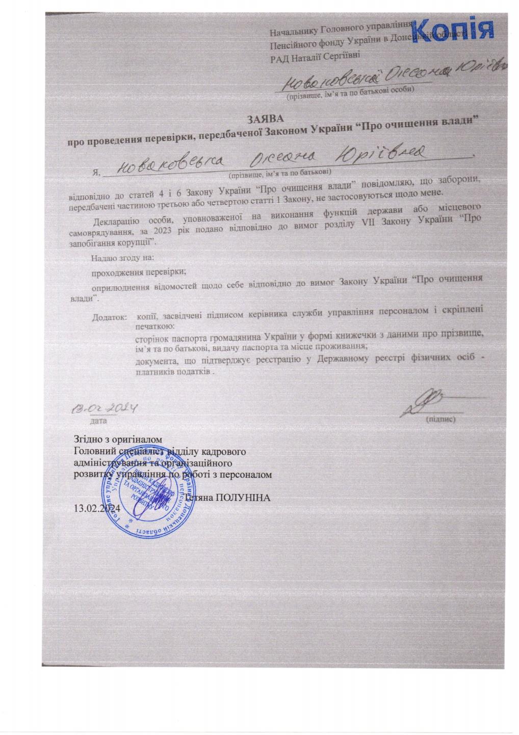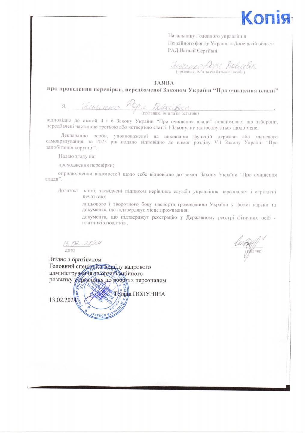 Інформація про початок проходження перевірки посадових осіб Головного управління Пенсійного фонду України в Донецькій області від 13.02.2024