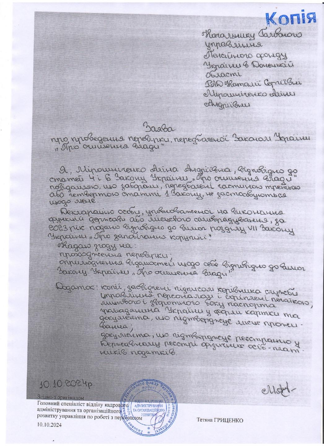 Інформація про початок проходження перевірки посадових осіб Головного управління Пенсійного фонду України в Донецькій області від 10.10.2024