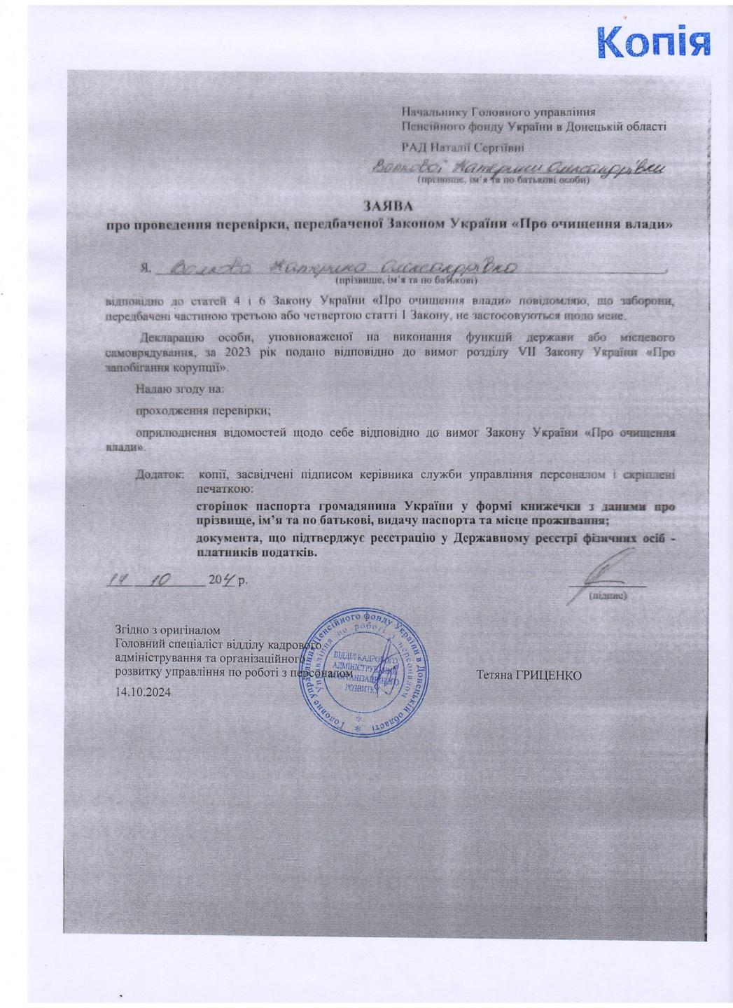 | Головне управління Пенсійного фонду України в Донецькій області | ВОЛКОВА Катерина Олександрівна | головний спеціаліст відділу забезпечення наповнення бюджету № 3 фінансово-економічного управління | 14.10.2024 |