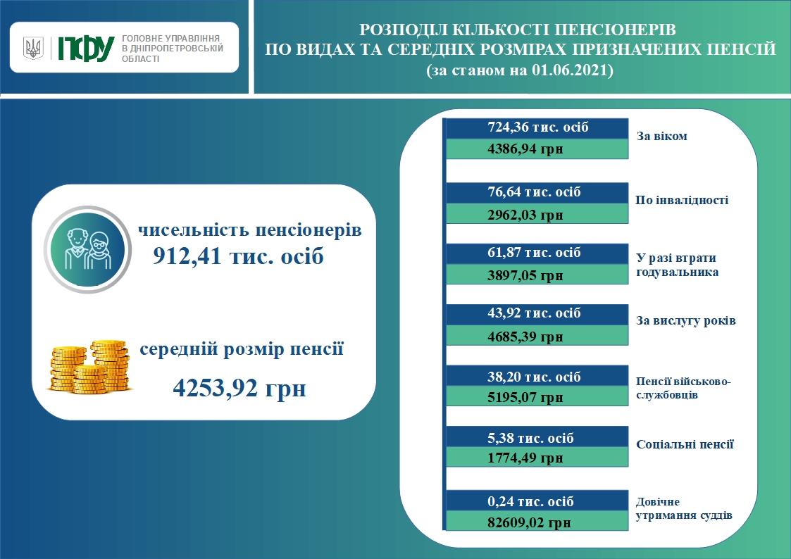Розподіл кількості пенсіонерів по видах та середніх розмірах призначених пенсій за станом на 01.06.2021