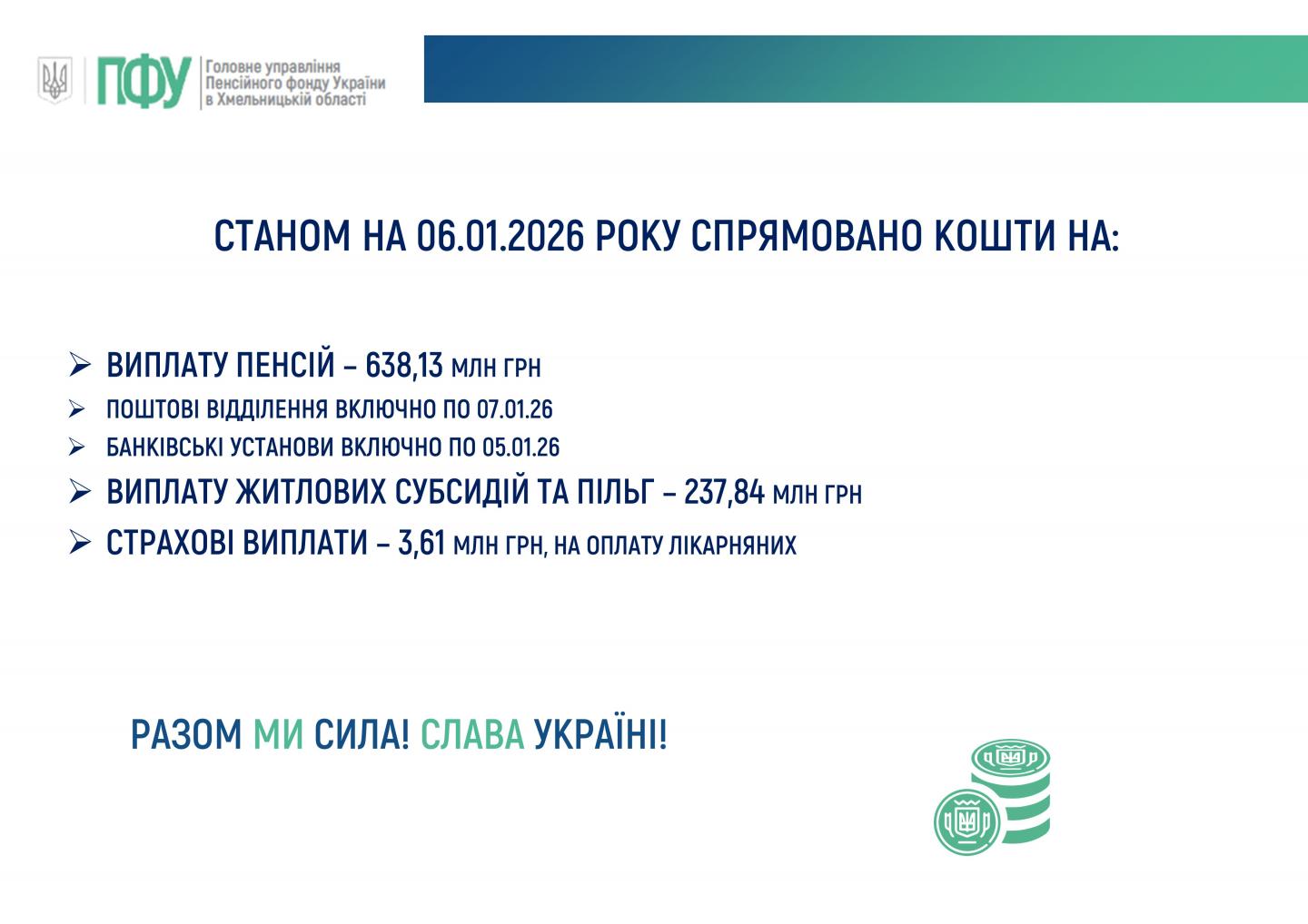 Головна / Пресцентр / Новини / 2026 / Стан фінансування пенсій, субсидій та страхових виплат, державних соціальних допомог на 06.01.2026 року