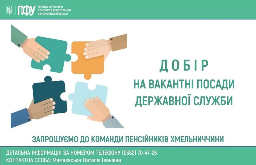 Головне управління Пенсійного фонду України в Хмельницькій області повідомляє про добір кандидатів на посади державної служби: Управління обслуговування громадян категорії…