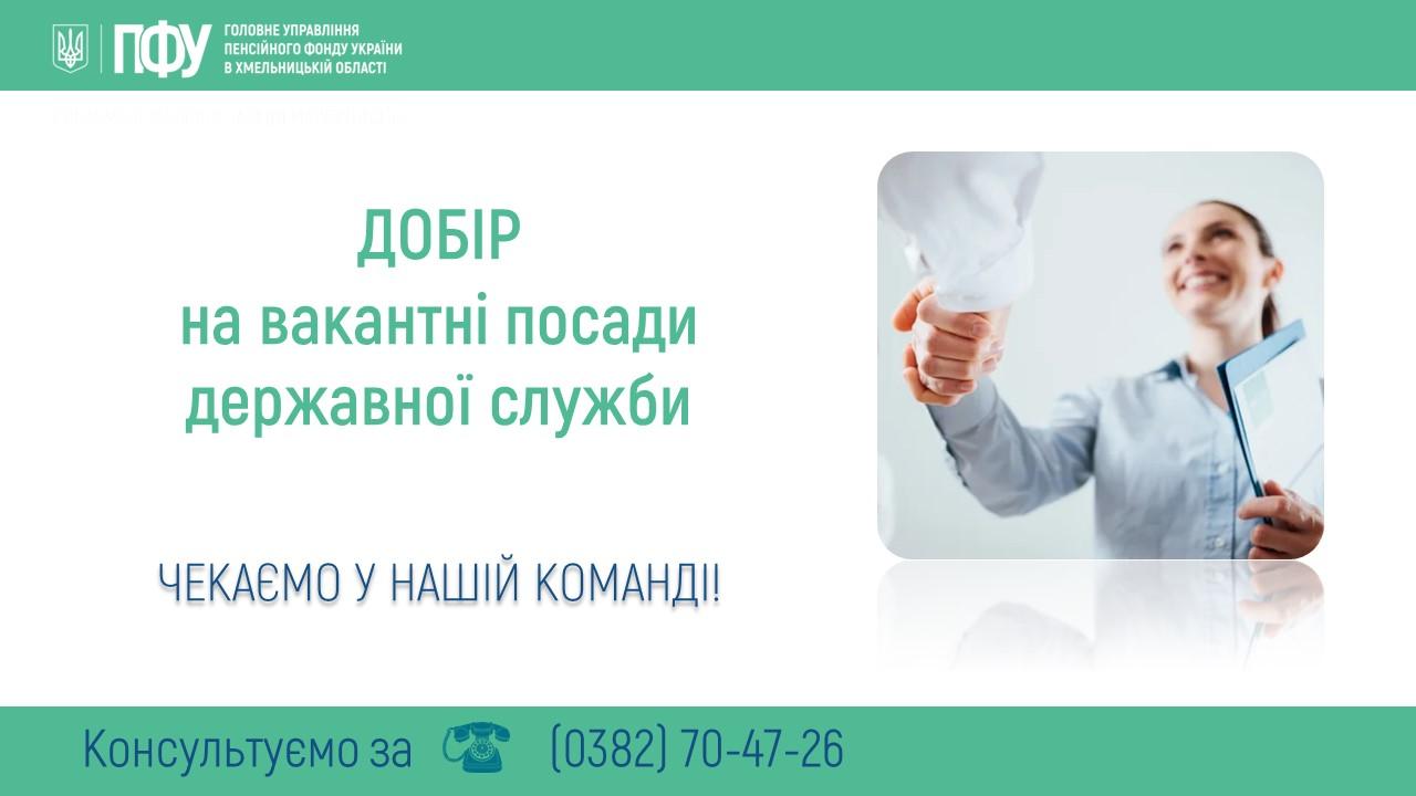 ІНФОРМАЦІЯ ПРО ОГОЛОШЕННЯ ДОБОРУ НА ЗАЙНЯТТЯ ПОСАД ДЕРЖАВНОЇ СЛУЖБИ Головне управління Пенсійного фонду України в Хмельницькій області повідомляє про добір…
