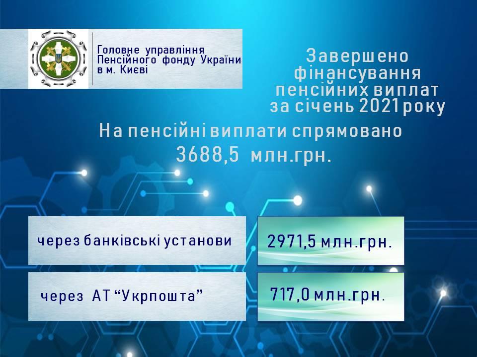Станом на 26 січня 2021 року Головним управлінням Пенсійного фонду України в м. Києві завершено у повному обсязі фінансування пенсійних виплат. На пенсійні виплати спрямовано 3688,5 млн. грн., з яких: