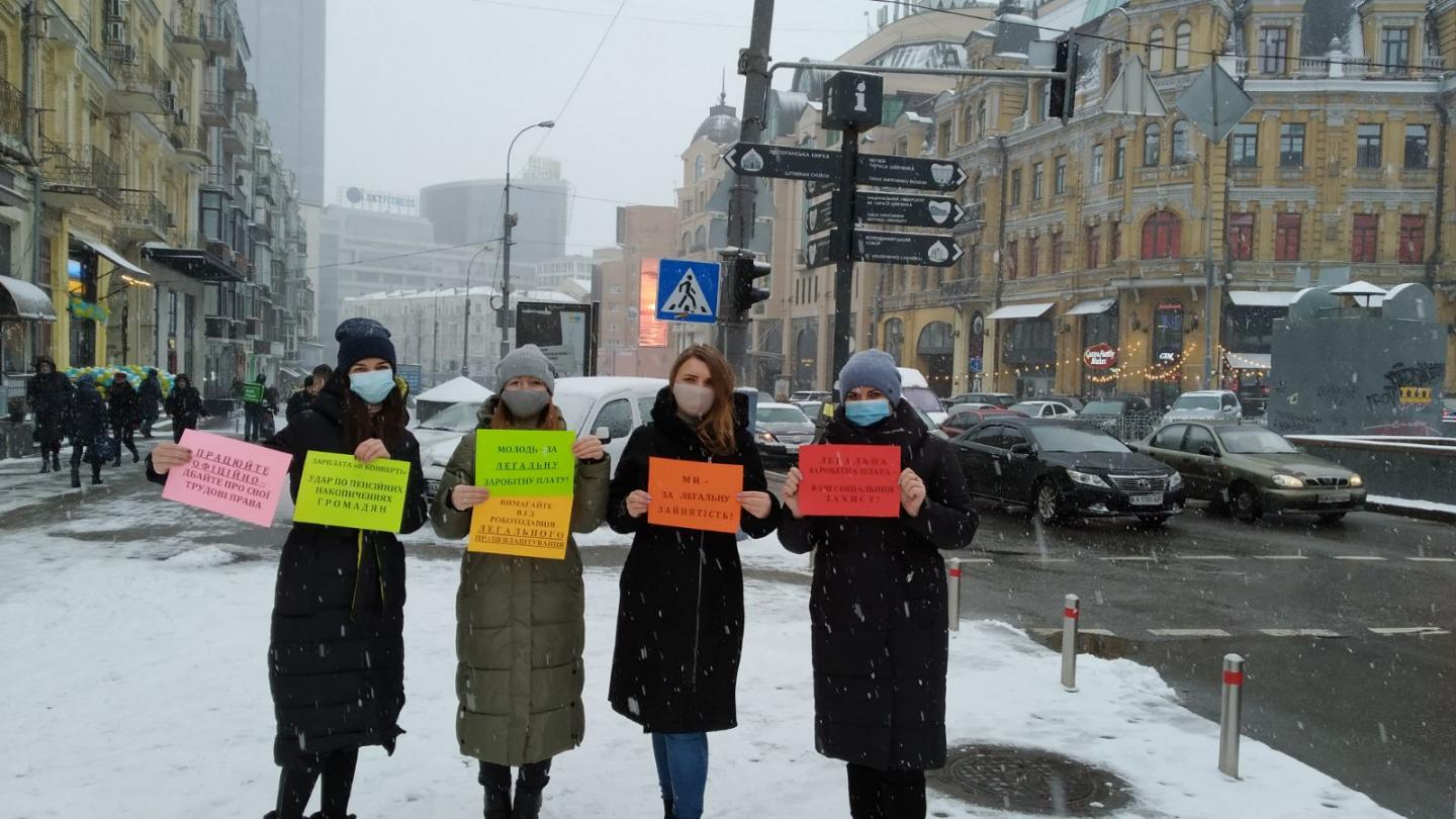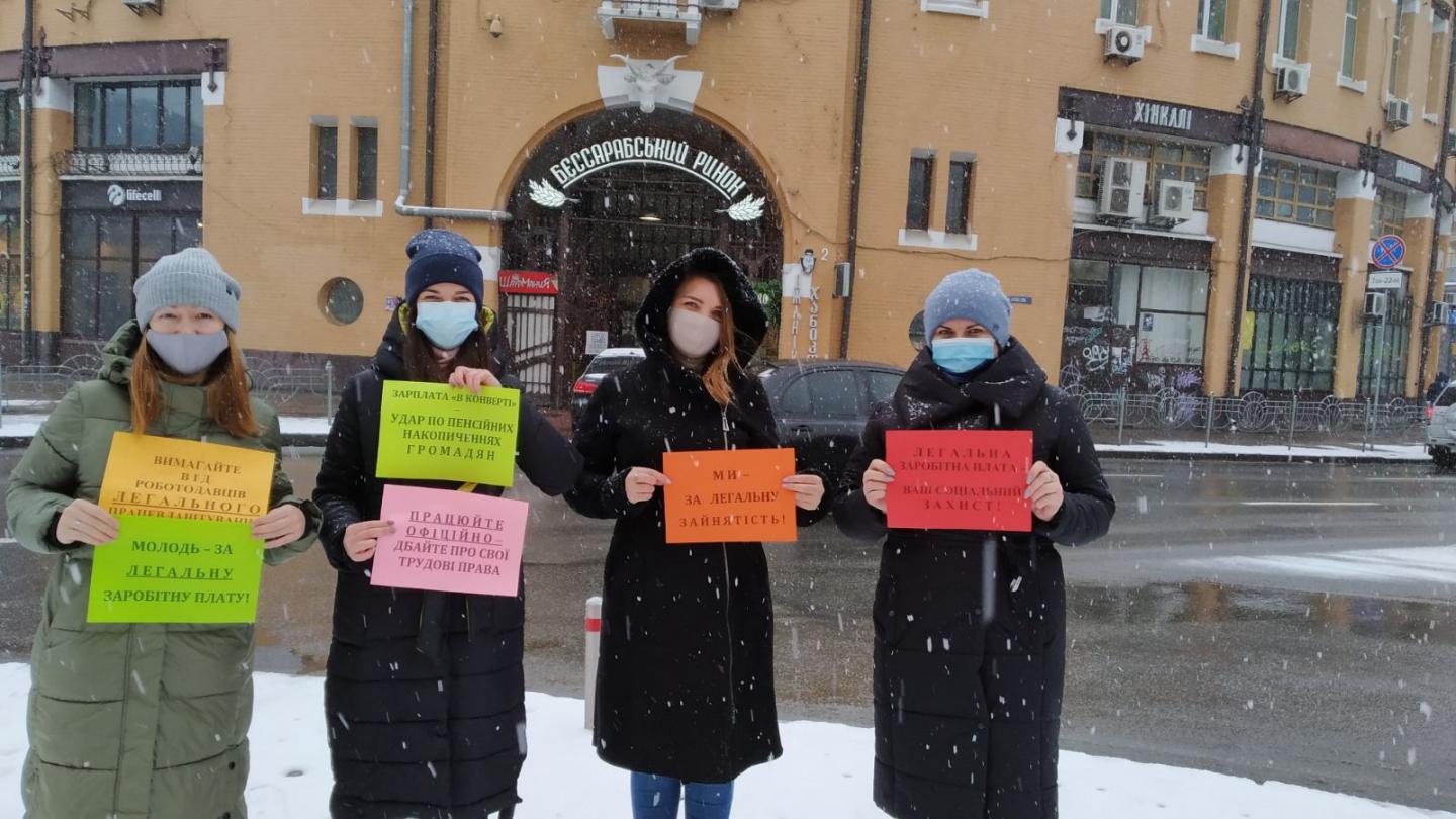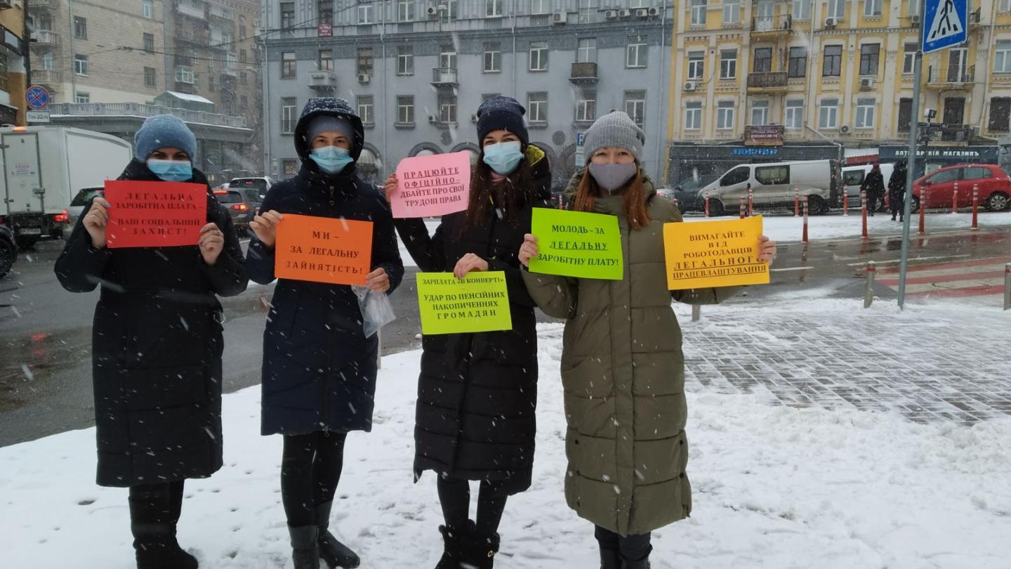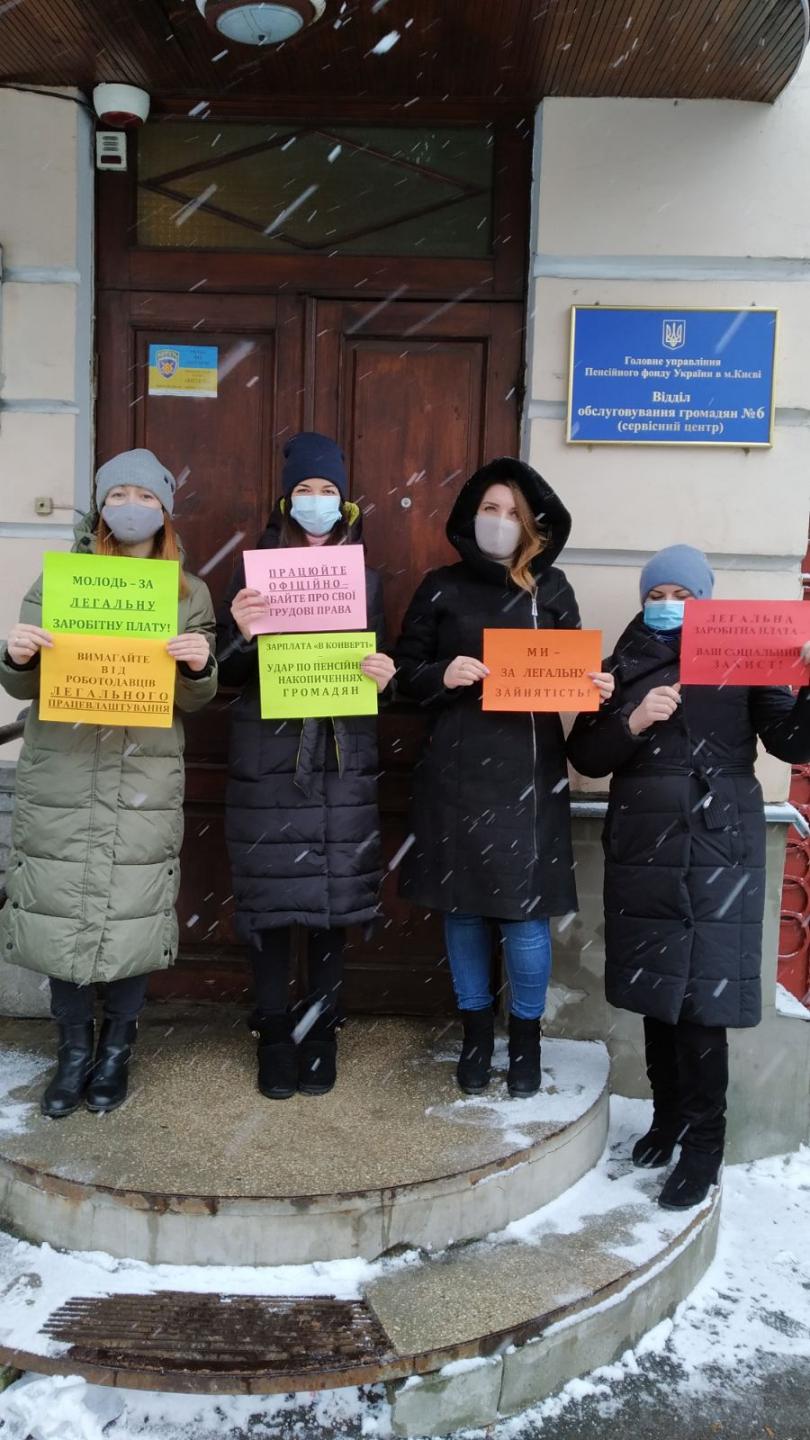 Працівники Головного управління Пенсійного фонду України в м. Києві 28 січня 2021 року провели на центральній, столичній вулиці Хрещатик флешмоб на тему легалізації заробітної плати.