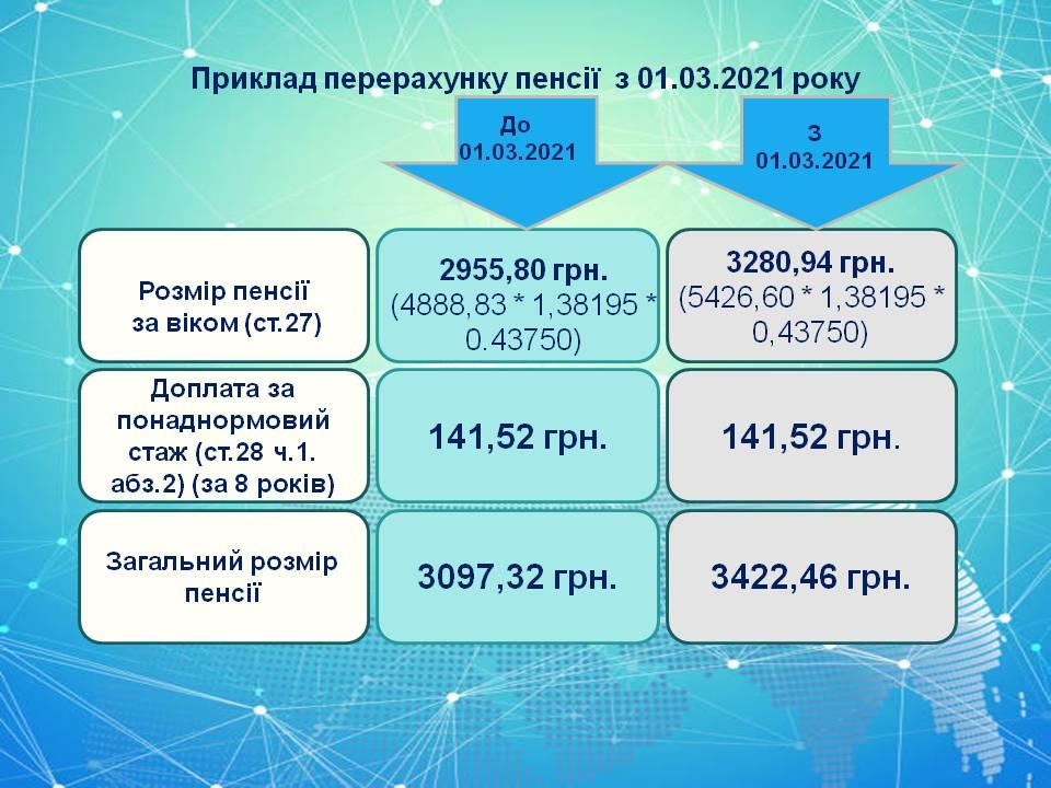 Відповідно до постанови Кабінету Міністрів України від 22.02.2021 № 127 «Про додаткові заходи соціального захисту пенсіонерів у 2021 році» у 2021 році перерахунок пенсій згідно з Порядком проведення перерахунку пенсій відповідно до частини другої статті 42 Закону України “Про загальнообов’язкове державне пенсійне страхування” (далі – Закон), затвердженим цією постановою, проводиться із застосуванням коефіцієнта збільшення показника середньої заробітної плати (доходу) в Україні, з якої сплачено страхові внески, та який враховується для обчислення пенсії в розмірі 1,11, а саме,
