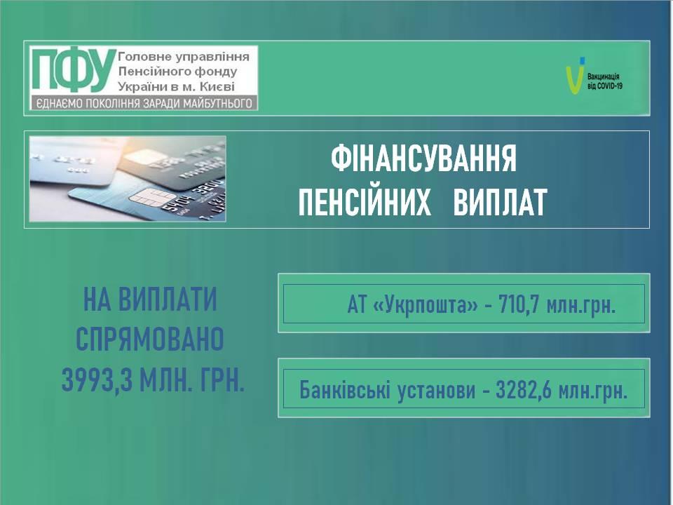 Станом на 25 жовтня 2021 року Пенсійним фондом України, згідно із затвердженим графіком, пенсіонерам міста Києва на пенсійні виплати спрямовано 3993,3 млн. грн.: