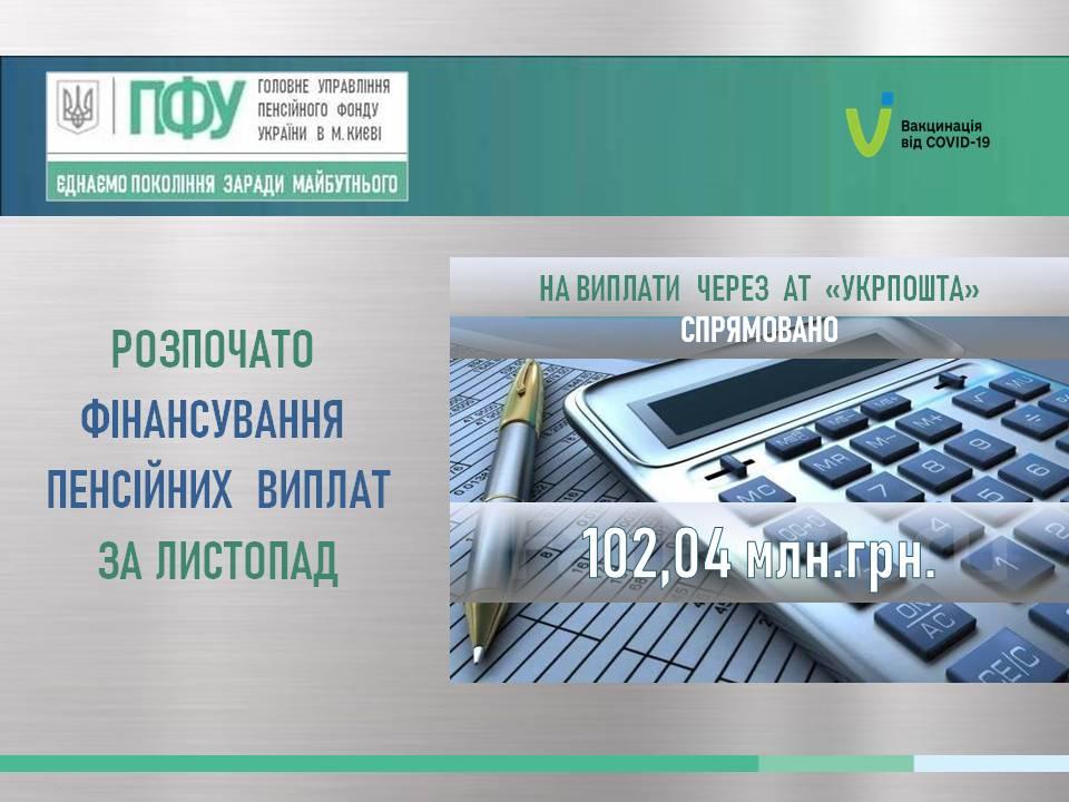 04 листопада 2021 року Пенсійним фондом України, згідно із затвердженим графіком, розпочато фінансування пенсій за поточний місяць. Пенсіонерам міста Києва на пенсійні виплати спрямовано через відділення АТ «Укрпошта» –102,4 млн.грн.