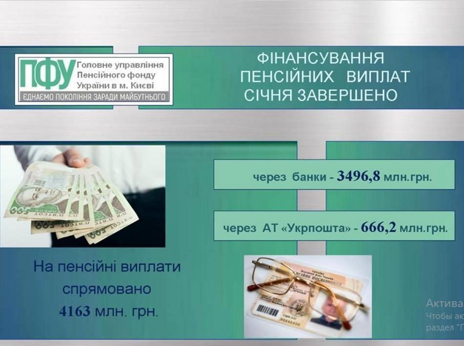 Згідно інформації, наданої Пенсійним фондом України, на фінансування пенсійних виплат у січні місяці 2022 року спрямовано 4163,0 млн. грн.: