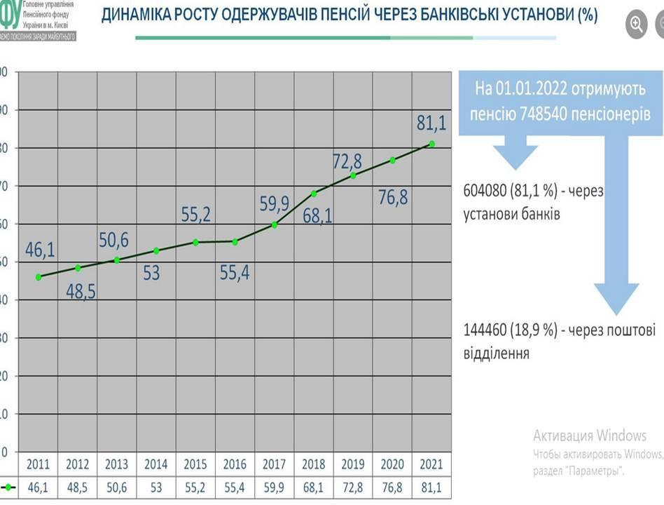 – на 4,3% збільшилась кількість пенсіонерів, що отримують пенсії через банківські установи;
