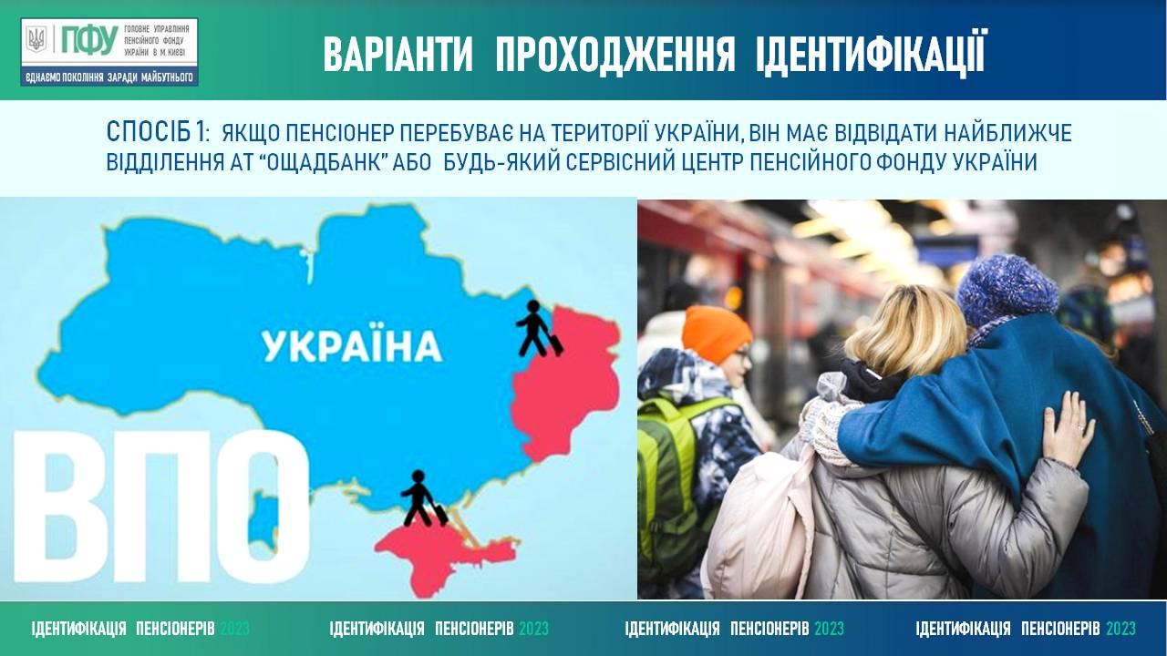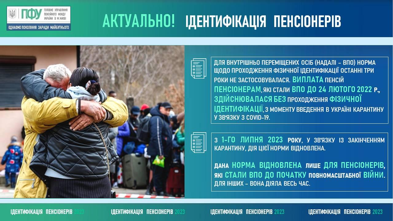 Для окремої категорії громадян (внутрішньо переміщених осіб, надалі – ВПО) норма проходження фізичної ідентифікації останні 3 роки не застосовувалась. Протягом трьох років виплата пенсій пенсіонерам, які стали ВПО до 24 лютого 2022 р., здійснювалася без проходження фізичної ідентифікації, з моменту введення в Україні карантину у зв‘язку з Covid-19.