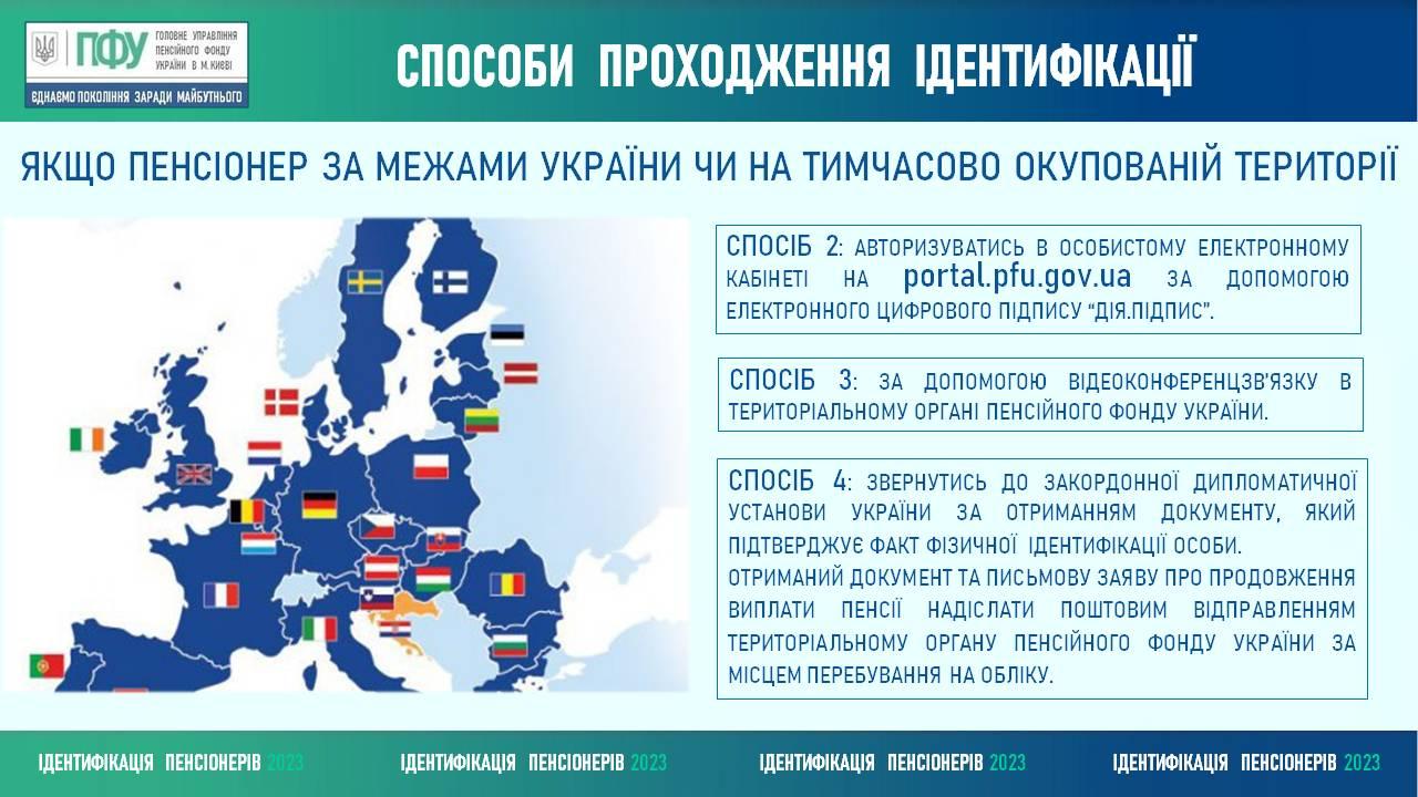 4. 4. В закордонній дипломатичній установі України отримати документ, який посвідчує, що фізична особа є живою, якщо пенсіонер з числа ВПО перебуває за кордоном. Видане в установленому порядку посвідчення разом із заявою про проходження ідентифікації (довільної форми) слід направити до територіального органу Пенсійного фонду України, де пенсіонер перебуває на обліку. Оригінал посвідчення разом із заявою можна направити засобами поштового зв’язку або в сканованому вигляді – через вебпортал електронних послуг Пенсійного фонду України з використанням засобів кваліфікованого електронного підпису.