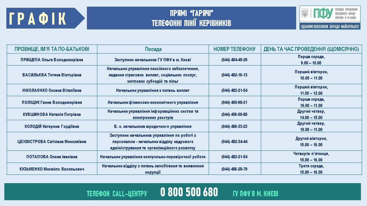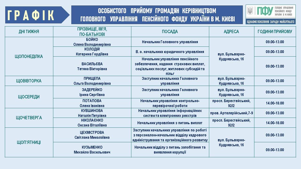 Графік особистого прийому громадян керівництвом Головного управління та керівниками структурних підрозділів Головного управління Пенсійного фонду України в м. Києві від 29.07.2024