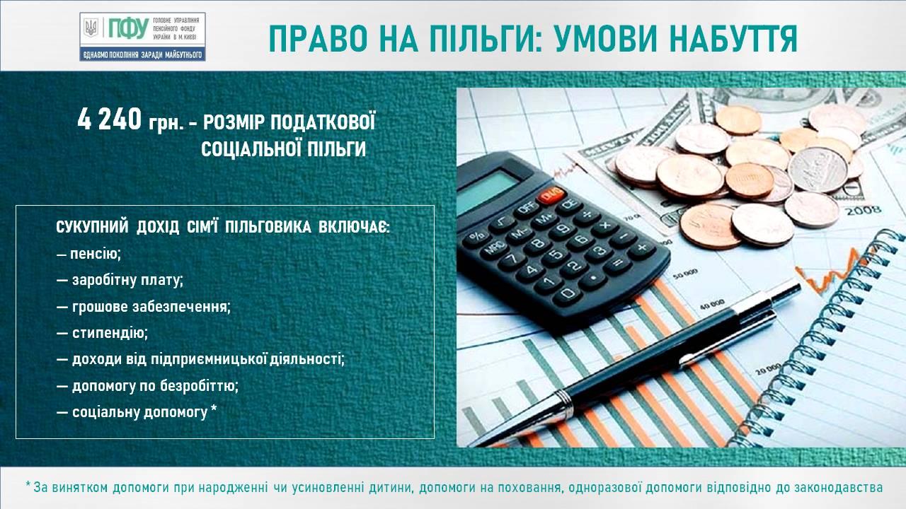 Пільговик, який відноситься до категорії тих, чиє право на пільги залежить від сукупного доходу сім’ї, має право на пільги за умови, якщо середньомісячний сукупний дохід сім’ї пільговика в розрахунку на одну особу не перевищує величину доходу, який дає право на податкову соціальну пільгу.