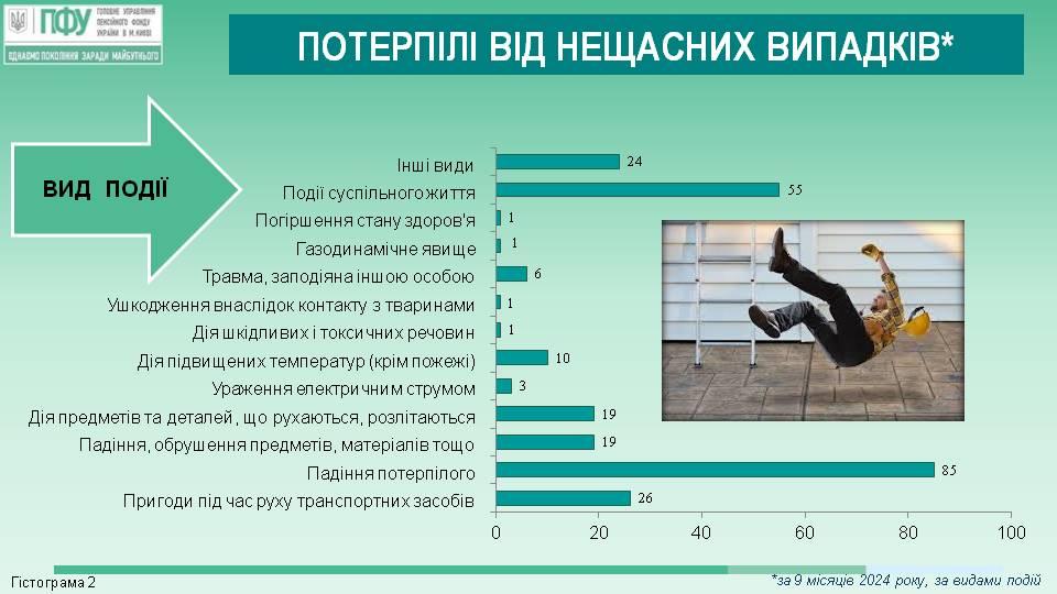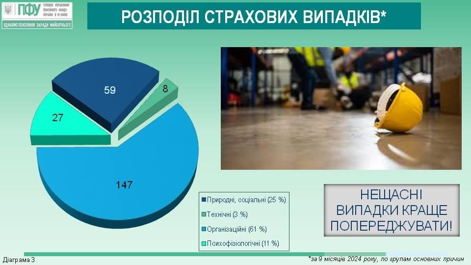 За 9 місяців 2024 року головні спеціалісти відділу профілактики та розслідування нещасних випадків управління контрольно-перевірочної роботи Головного управління, які наділені повноваженнями страхових експертів з охорони праці, взяли участь у роботі 400 комісій з розслідування та спеціального розслідування нещасних випадків і професійних захворювань на виробництві, в тому числі 21 групових нещасних випадків, 26 нещасних випадків із смертельним наслідком, 66 випадків смерті на підприємстві, 2 гострих професійних захворювань, 8 нещасних випадків з можливою інвалідністю, 277 нещасний випадок з тимчасовою втратою працездатності.