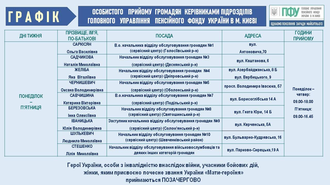 Змінено графік особистого прийому громадян керівництвом Головного управління та керівниками структурних підрозділів Головного управління Пенсійного фонду України в м. Києві 28.11.2024