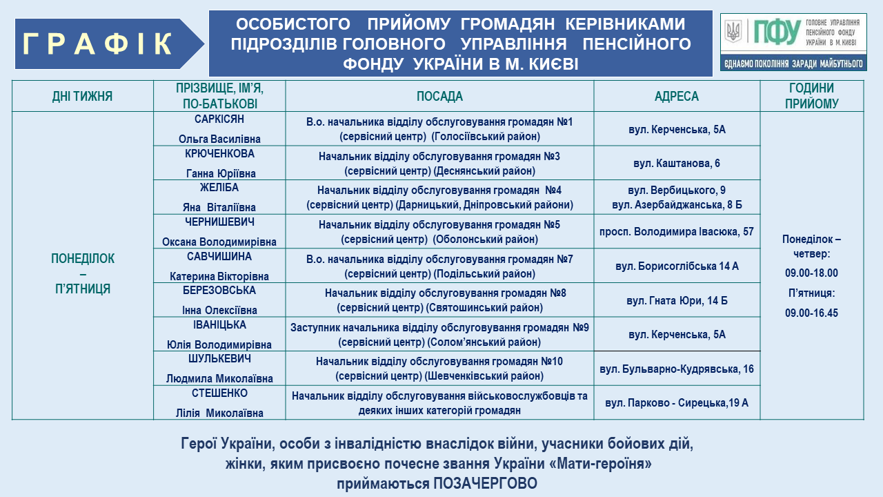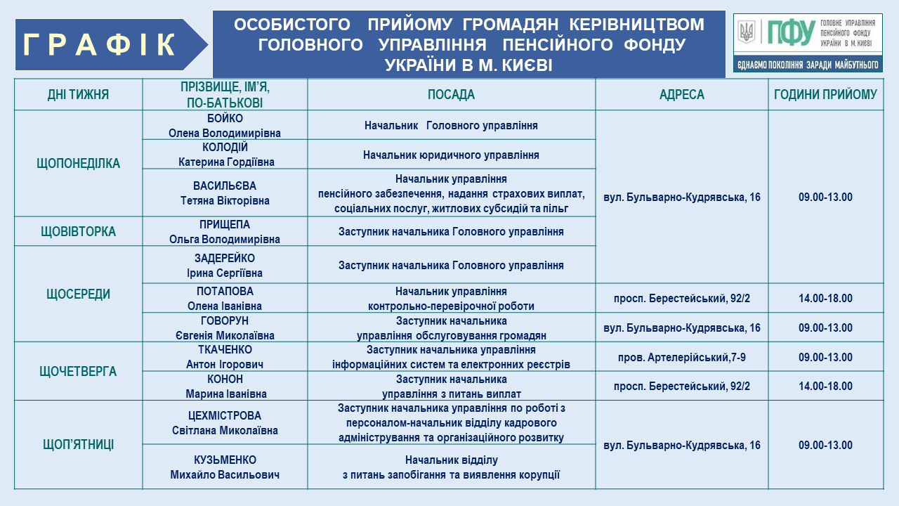 Змінено графік особистого прийому громадян керівництвом Головного управління та керівниками структурних підрозділів Головного управління Пенсійного фонду України в м. Києві 25.02.2025