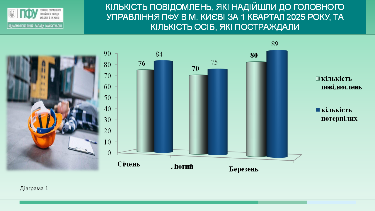 У І кварталі 2025 року до Головного управління Пенсійного фонду України в м. Києві (далі – Головне управління) надійшло 226 повідомлень про нещасні випадки, внаслідок яких постраждали 248 осіб, в т. ч. 67 – зі смертельним наслідком (діаграма 1).