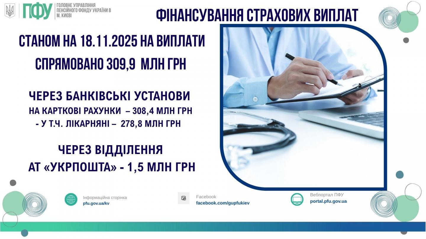 Станом на 18.11.2025 року профінансовано страхові виплати та інші грошові виплати у жовтні місяці на суму 309,9 млн грн: