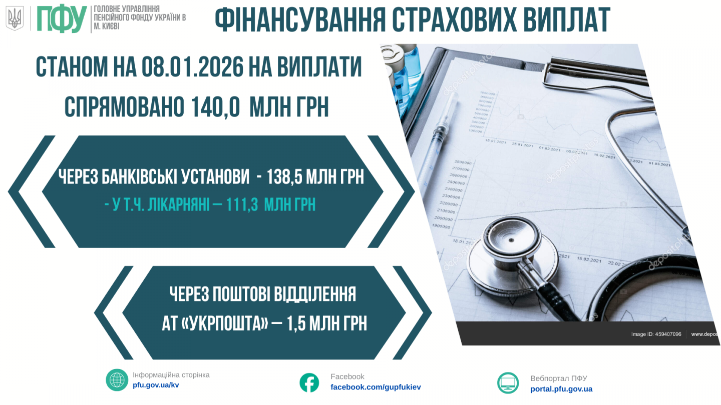 Станом на 08.01.2026 року профінансовано страхові виплати та інші грошові виплати у січні місяці на суму 140,0 млн грн: