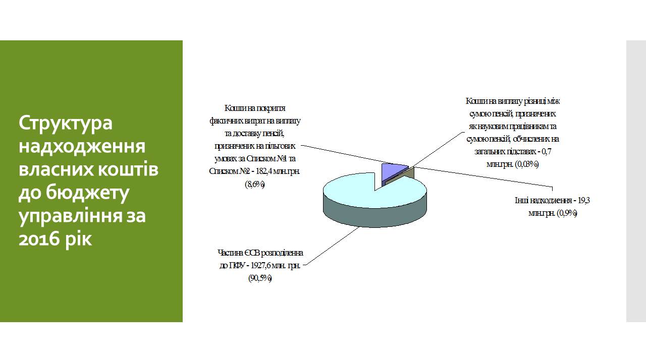 Виконання плану по надходженню власних коштів – частини ЄСВ, розподіленої на пенсійне страхування за січень – грудень 2016 року забезпечено на 89,3 %, надійшло 1927,6 млн. грн.