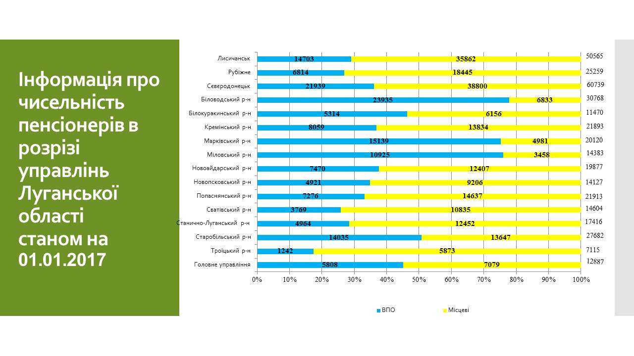 223,5 тис. пенсіонерів отримують пенсійні виплати в банківських установах, що становить 64,6 % від їх загальної чисельності. Вище середньообласного цей відсоток у Біловодському районі – 83,5 %, в Міловському районі – 79,0 % та в Марківському – 78,7 %. Найменший – в Троїцькому районі – 33,2 %. Економія коштів Державного бюджету за рахунок отримання пенсійних виплат через установи банків склала за 2016 рік 69,5 млн.грн.