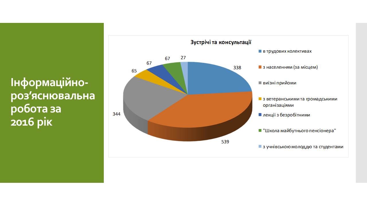 За 2016 рік проведено 1286 зустрічей у трудових колективах, з ветеранськими та громадськими організаціями, з населенням і виїзних прийомів, якими охоплено 18,0 тис. громадян.