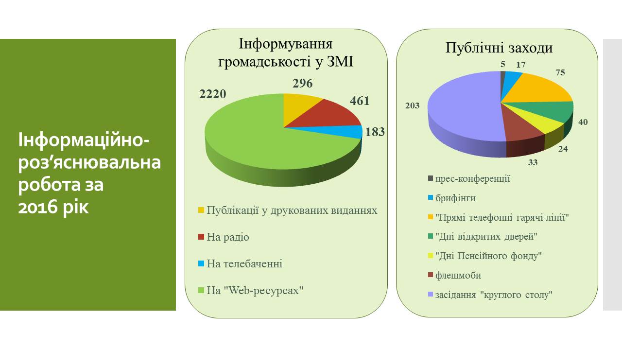 Так, за 2016 рік проведено 203 засідання «круглого столу», 17 брифінгів, 5 прес-конференцій. В населених пунктах області проведено 33 флешмоби, 67 занять школи майбутнього пенсіонера, 27 зустрічей з учнівською молоддю і студентами, 67 лекцій для безробітних, 64 «Днів відкритих дверей» і «Днів Пенсійного фонду», якими охоплено понад 4,3 тис. громадян.