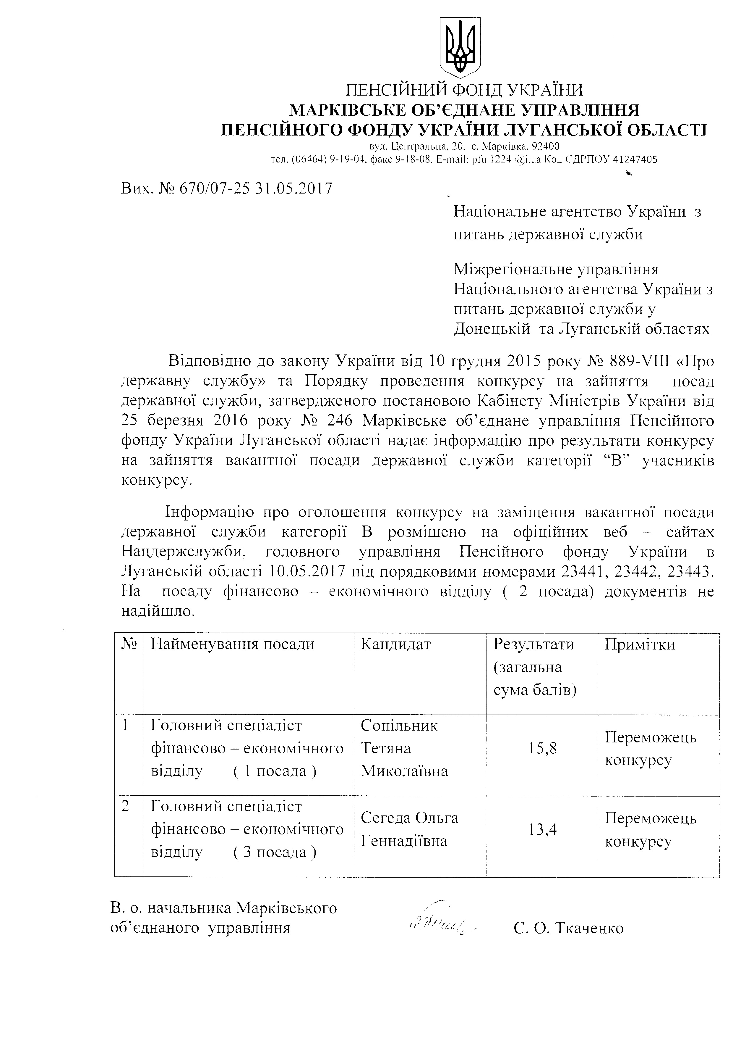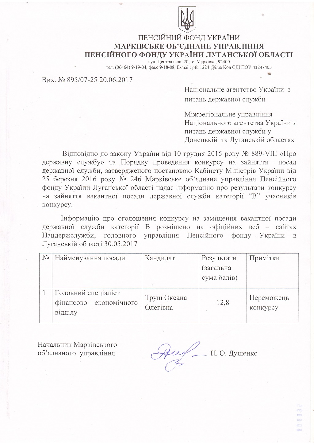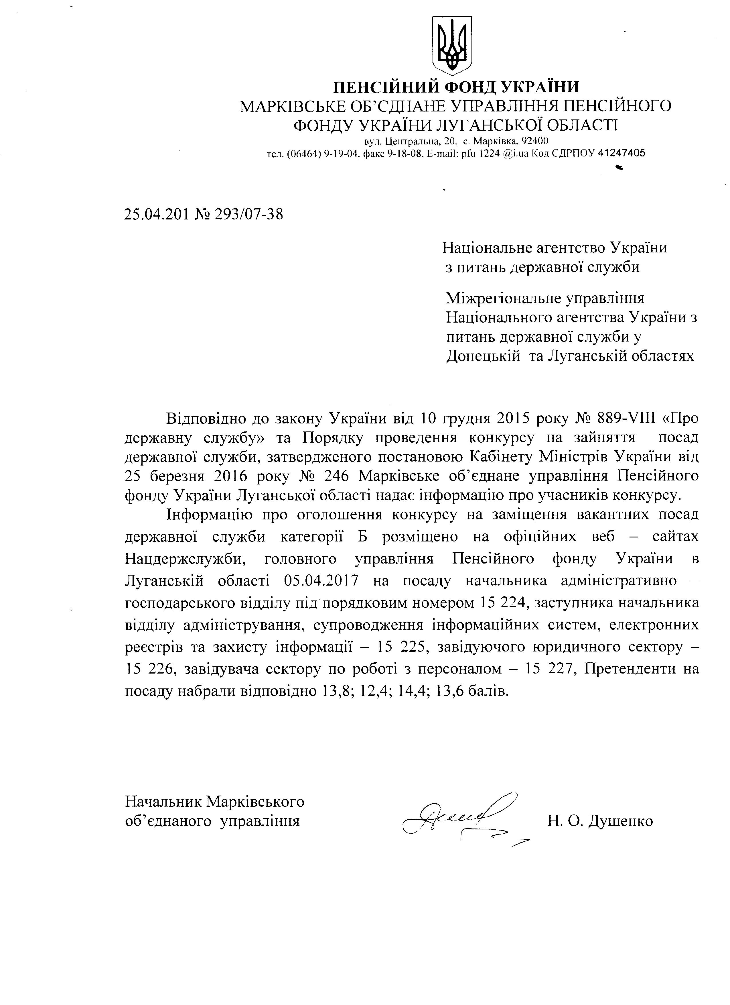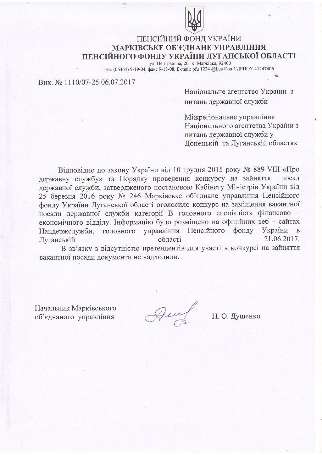 Відповідно до статті 28 глави 2 Закону України від 10 грудня 2015 року № 889-VIII «Про державну службу», постанови Кабінету Міністрів України від 25.03.2016 № 246 ’’Про затвердження Порядку проведення конкурсу на зайняття посад державних службовців ( зі змінами ), Марківське об’єднане управління Пенсійного фонду України Луганської області повідомляє про те, що конкурс на зайняття вакантної посади державної служби категорії В спеціаліста Новопсковського відділу з питань призначення, перерахунку та виплати пенсій оголошено 28 травня 2019 року ( наказ об’єднаного управління від 28.05.2019 № 161) та оприлюднено на офіційних веб – сайтах Нацдержслужби 28.05.2019 під порядковим номером 147559, головного управління Пенсійного фонду України в Луганській області.