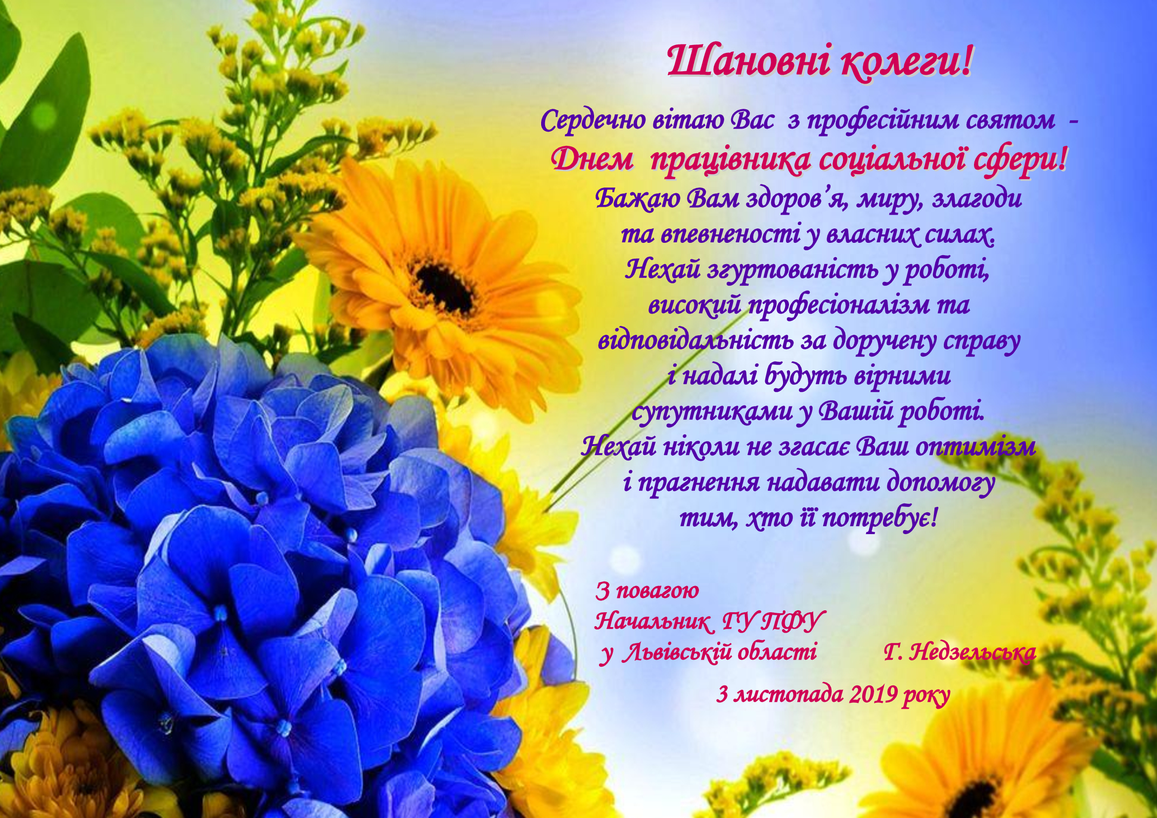 Привітання начальника Головного управління Пенсійного фонду України у Львівській області з Днем працівника соціальної сфери
