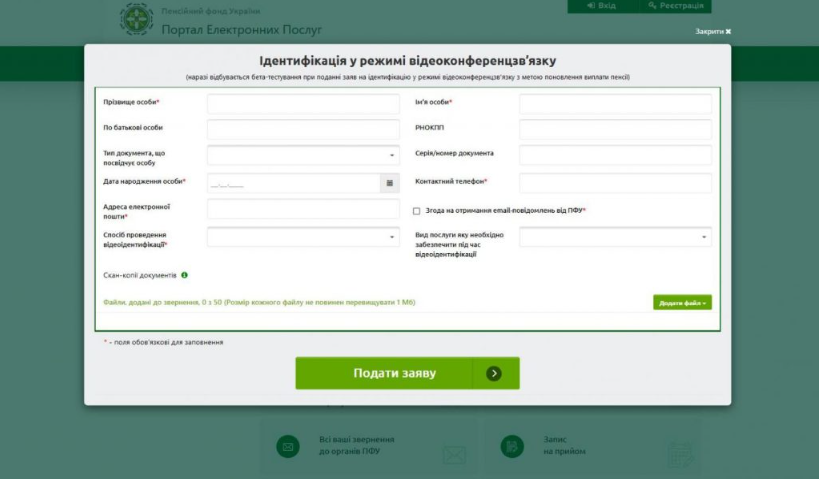- До заяви можуть бути додані (у вигляді прикріплених файлів) ідентифікаційні документи: паспорт, пенсійне посвідчення, довідка про присвоєння ідентифікаційного номера, свідоцтво про народження, трудова книжка тощо (розмір кожного файлу не повинен перевищувати 1 Мб).