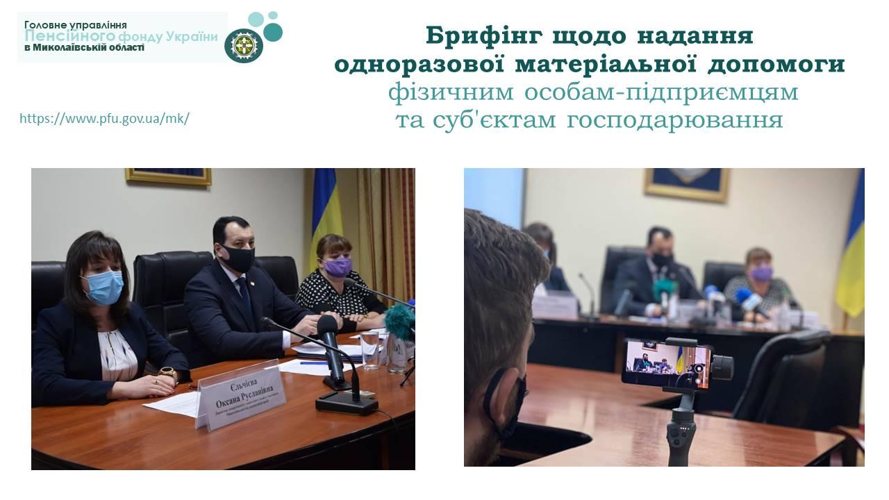 22 грудня заступник начальника управління – начальник відділу забезпечення наповнення бюджету фінансово-економічного управління Головного управління Пенсійного фонду України в Миколаївській області Ауріка Федорова прийняла участь у брифінгу обласної державної адміністрації щодо надання одноразової матеріальної допомоги фізичним особам-підприємцям і суб’єктам господарювання.