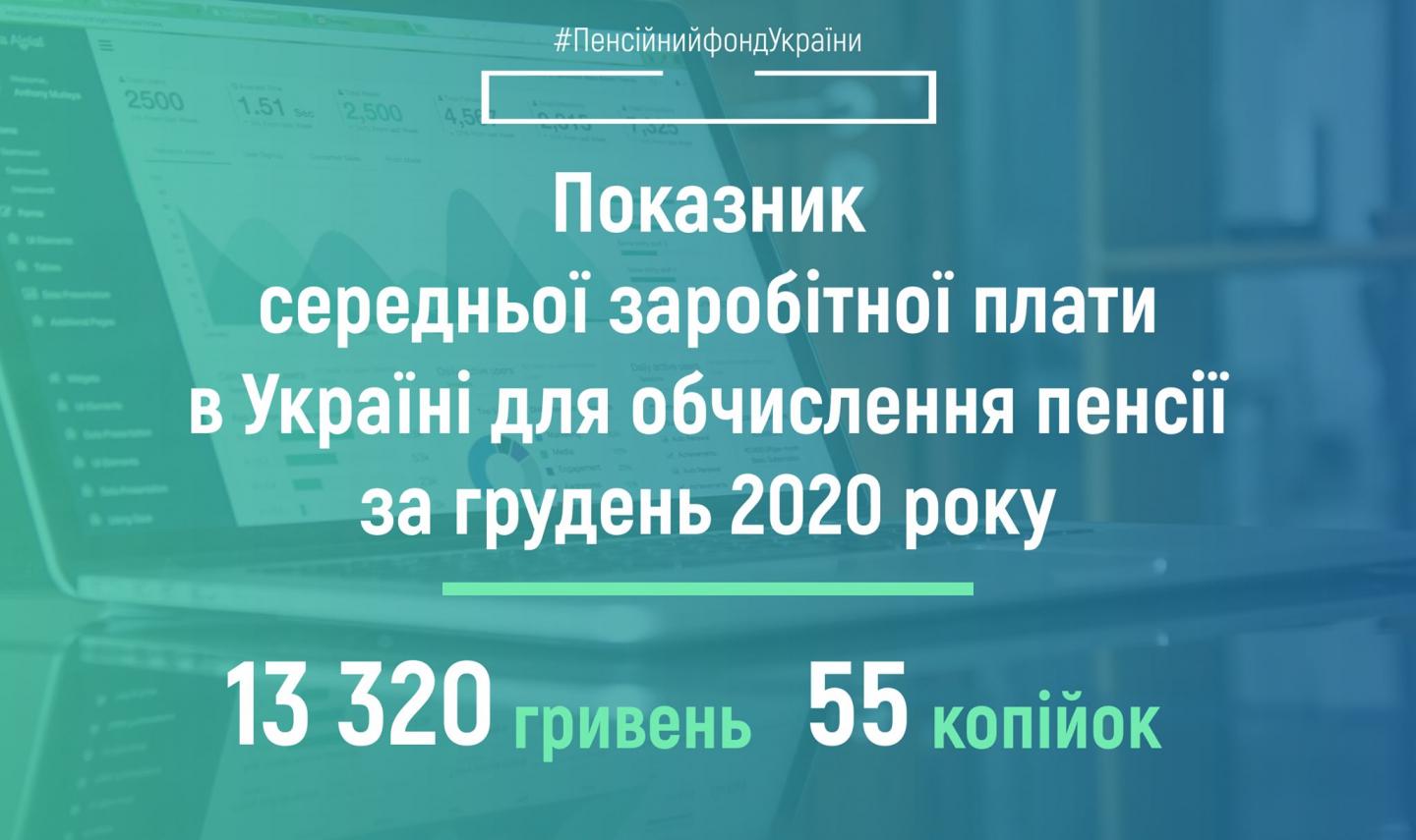 Затверджено показник середньої заробітної плати (доходу) в Україні, з якої сплачено страхові внески та яка відповідно до Закону України “Про загальнообов’язкове державне пенсійне страхування” враховується для обчислення пенсії, за грудень 2020 року в сумі 13 320 гривень 55 копійок та за 2020 рік – в сумі 10 340 гривень 35 копійок.