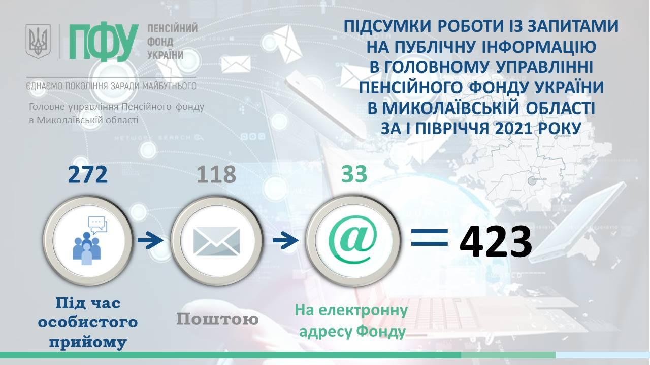 Відповідно до Закону України «Про доступ до публічної інформації» за І квартал 2021 року Головним управлінням Пенсійного фонду України в Миколаївській області опрацьовано 423 інформаційних запита.