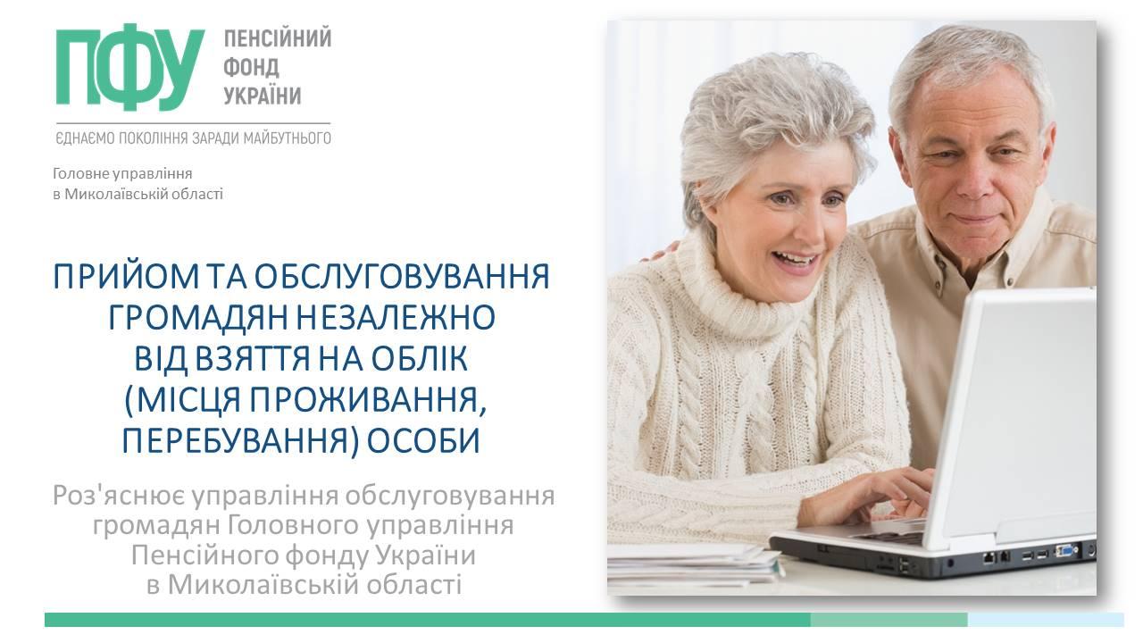 Відповідно до Положення про організацію прийому та обслуговування осіб, які звертаються до органів Пенсійного фонду України затвердженого Постановою правління Пенсійного фонду України від 30.07.2015 № 13-1 (із змінами) прийом та обслуговування здійснюються незалежно від взяття на облік (місця проживання, перебування) особи на території обслуговування відповідного органу Пенсійного фонду з питань:
