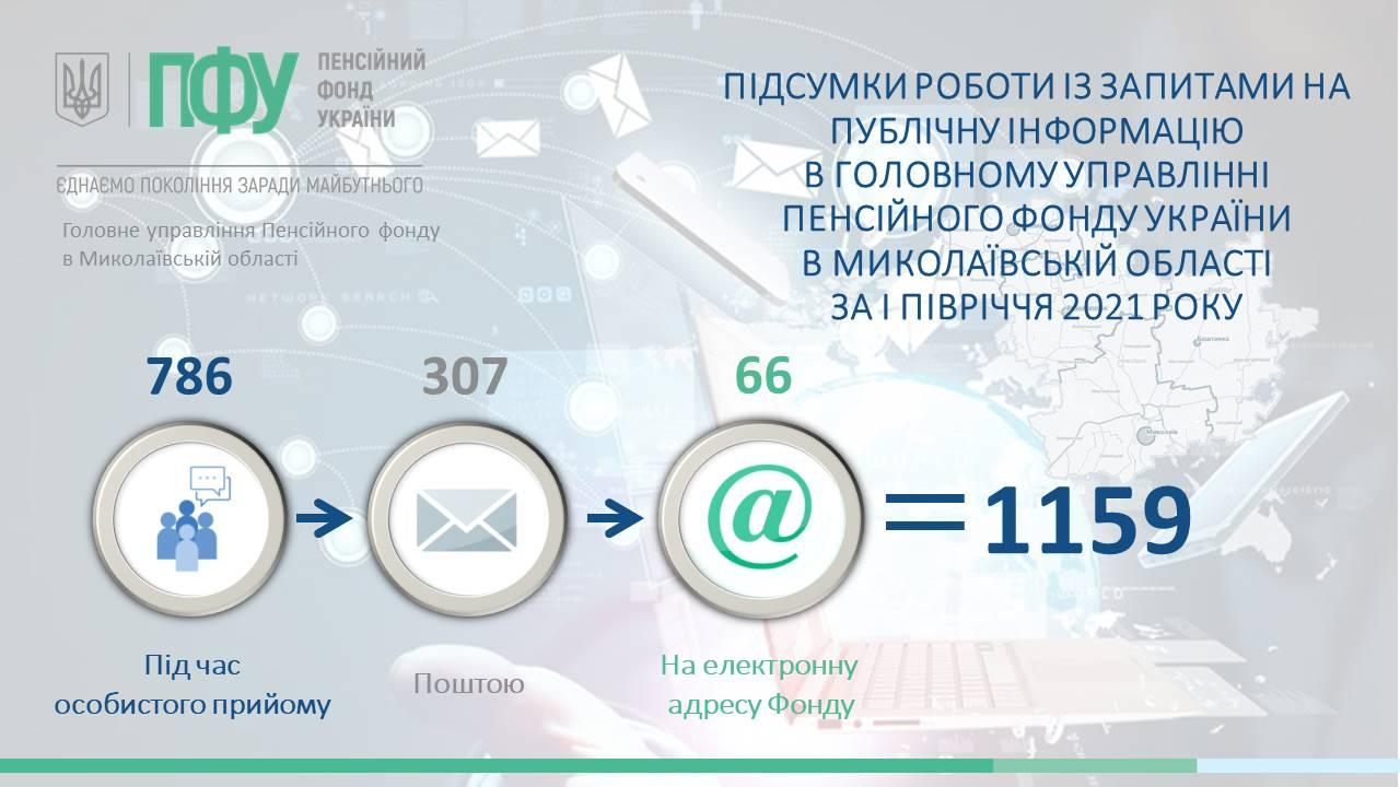 Відповідно до Закону України «Про доступ до публічної інформації» за І півріччя 2021 року Головним управлінням Пенсійного фонду України в Миколаївській області опрацьовано 1159 інформаційних запитів. Найбільшу кількість запитів отримано під час особистого прийому – 786, через поштові відділення зв’язку – 307, на електронну адресу Головного управління фонду надійшло 66 інформаційних запитів. За категорією запитувачів найбільше запитів отримано від фізичних осіб – 1150, від юридичних – 9.