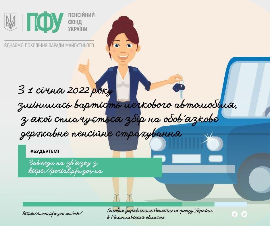 З 1 січня 2022 року змінилась вартість легкового автомобіля, з якої сплачується збір на обов’язкове державне пенсійне страхування
