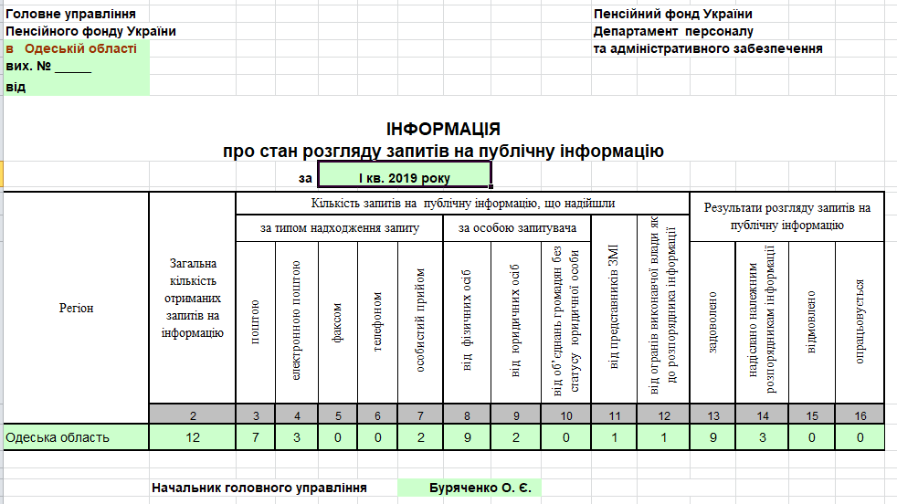 Інформація про стан розгляду запитів на публічну інформацію в головному управлінні Пенсійного фонду України в Одеській області за 1 квартал 2019 року