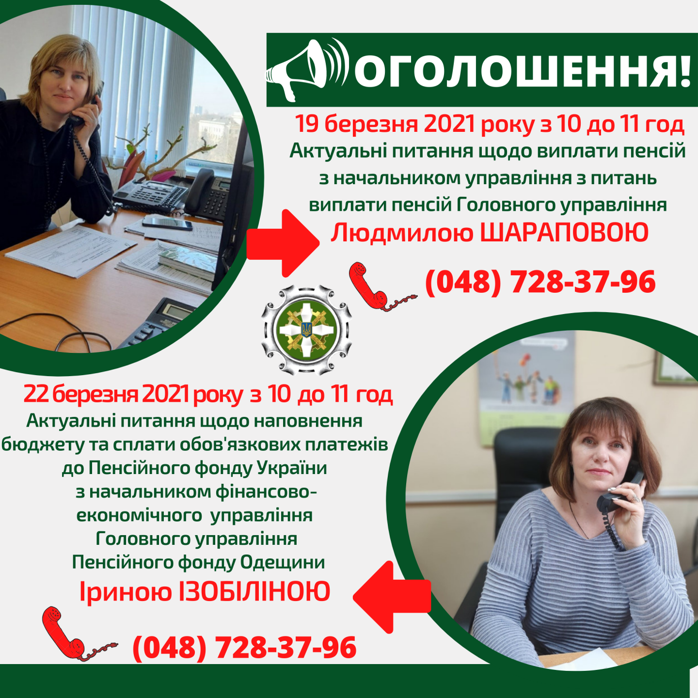 УВАГА!!! “Пряма телефонна гаряча лінія” керівників Головного управління Пенсійного фонду Одещини