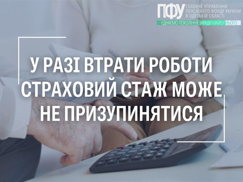 При втраті роботи страховий стаж не зупиняється лише в одному разі — за наявності офіційного статусу безробітного в центрі зайнятості й отриманні у зв’язку з цим грошової допомоги. Це може бути допомога по безробіттю (крім одноразової виплати для організації безробітним підприємницької діяльності) або матеріальна допомога під час професійної підготовки, перепідготовки або підвищення кваліфікації. Це передбачено Законом України від 09.07.2003 № 1058 «Про загальнообов’язкове державне пенсійне страхування» (з 1 січня 2004 року), відповідно до якого до страхового стажу враховуються місяці, в яких сплачено страхові внески.