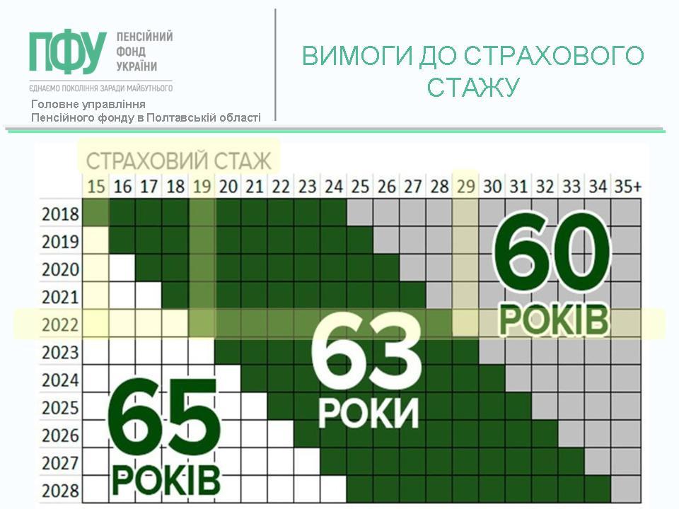 У 2022 році (з 1 січня по 31 грудня) право вийти на пенсію у 60 років матимуть люди, у яких страховий стаж становить не менше 29-ти років.
