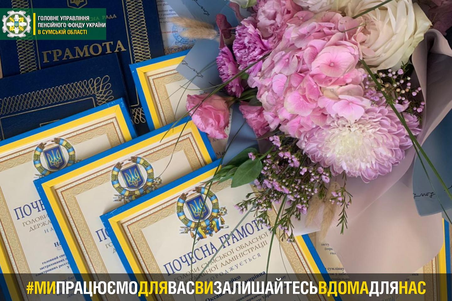 Почесною грамотою голови Сумської обласної державної адміністрації: Марина МАЙФАТ — начальник відділу з питань виплати пенсій військовослужбовців та деяких інших категорій громадян управління з питань виплати пенсій; Ріта ДЗЮБА — заступник начальника відділу обслуговування громадян № 9 (сервісного центру) управління обслуговування громадян; Наталія ХАРЛАШКО — головний спеціаліст відділу ведення карток реєстру застрахованих осіб управління інформаційних систем та електронних реєстрів.