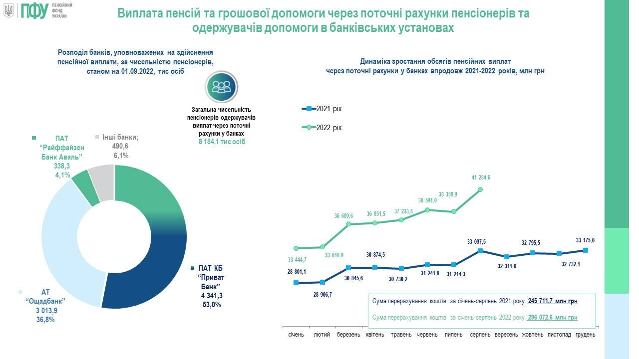 Дані про розподіл банків уповноважених на здійснення пенсійної виплати за чисельністю пенсіонерів та динаміку зростання обсягів пенсійних виплат через поточні рахунки у банках впродовж 2021-2022 років станом на 01.08.2022 року