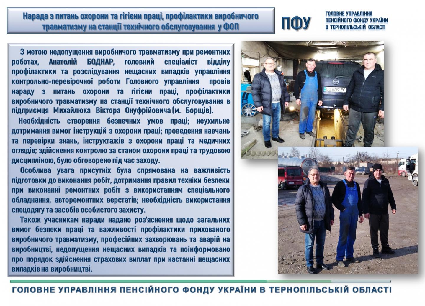 З метою недопущення виробничого травматизму при ремонтних роботах, Анатолій Боднар, головний спеціаліст відділу профілактики та розслідування нещасних випадків управління контрольно-перевірочної роботи Головного управління провів нараду з питань охорони та гігієни праці, профілактики виробничого травматизму на станції технічного обслуговування в підприємця Михайлюка Віктора Онуфрійовича (м. Борщів).